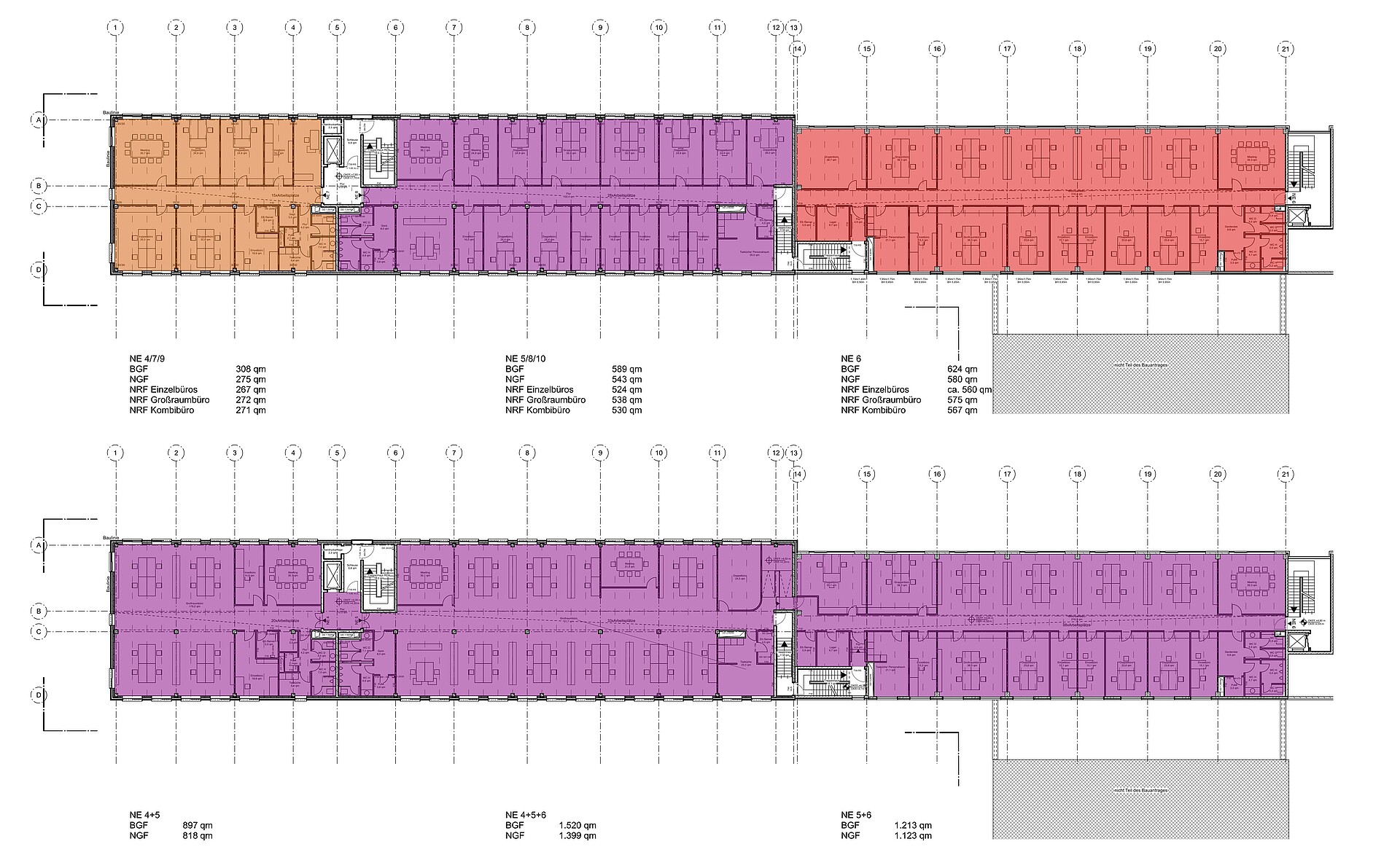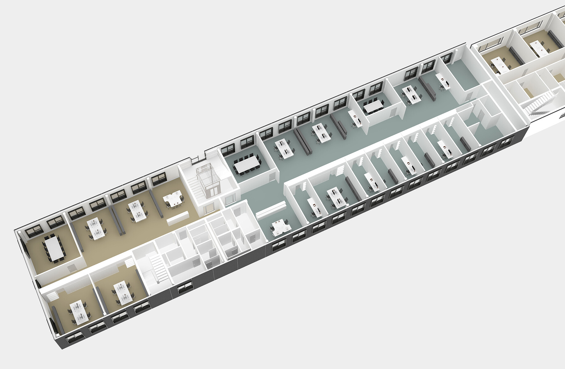 Das langgestreckte Gebäude soll flexibel teilbar und vermietbar sein. Es werden verschiedene Aufteilungsvarianten für die Geschosse als Zellen-, Gruppen- und Großraumbüros angeboten. Auch innerhalb der Geschosse ist die Unterteilung in mehrere Einheiten möglich.