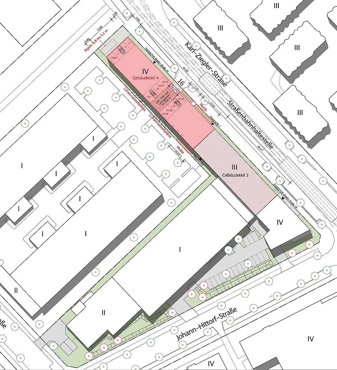 Die Grundwasserverhältnisse machen ein Kellergeschoss unwirtschaftlich. Das Dach wird als Retentionsdach ohne Gefälle und mit extensiver Begrünung konzipiert. Die Fassaden erhalten eine wartungsfreie Plattenverkleidung.
