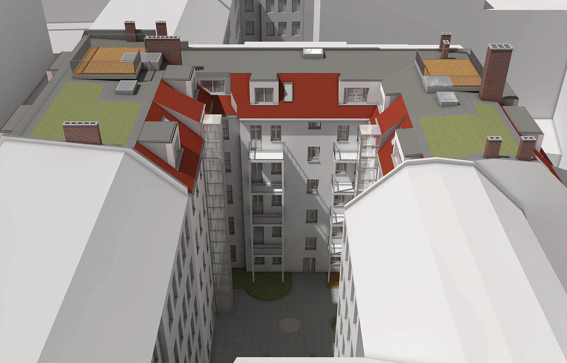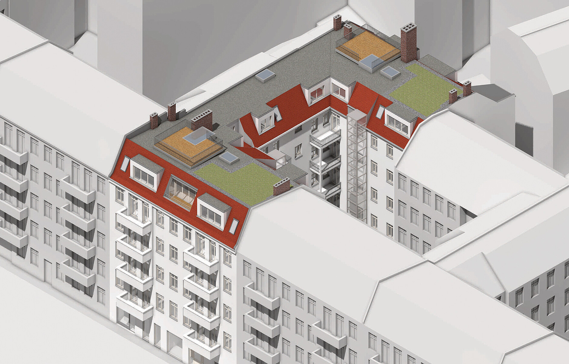 Die Belichtung des Dachgeschosses erfolgt im Wesentlichen durch neu eingebaute Gauben sowie einzelne Dachflächenfenster. Die beiden straßenseitigen Gauben nehmen in Lage und Breite die darunterliegenden Balkone auf. Die im 4. OG vorhandenen Pilaster wurden optisch in den Gaubenfronten aufgenommen und im Sturz als Portal zusammengefasst.
