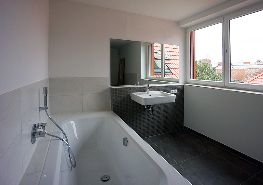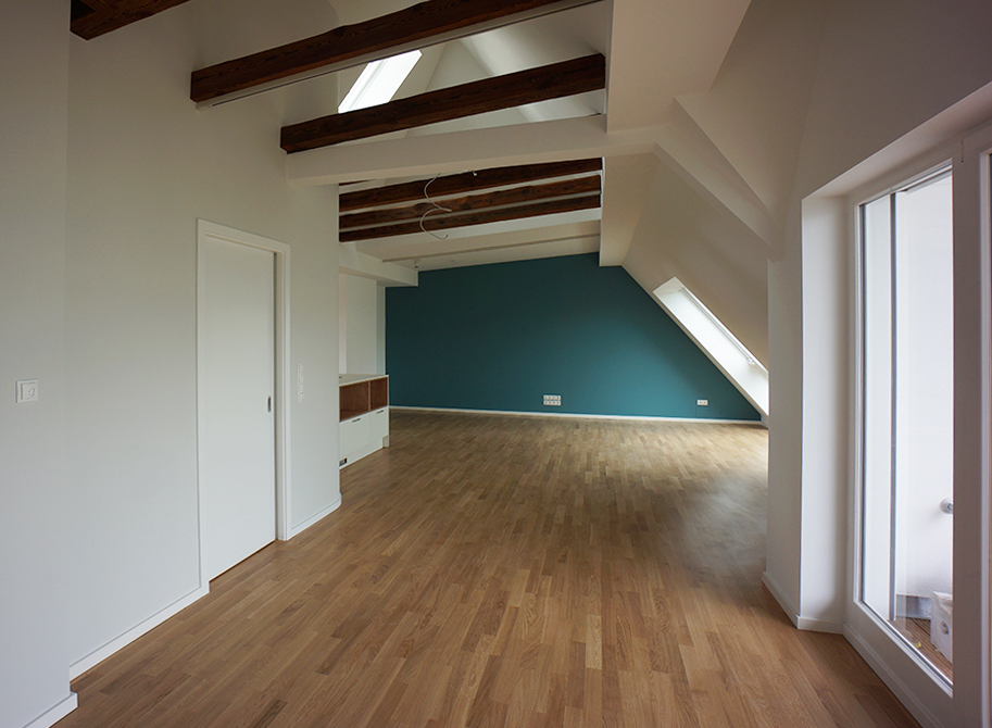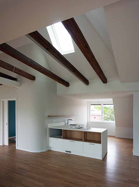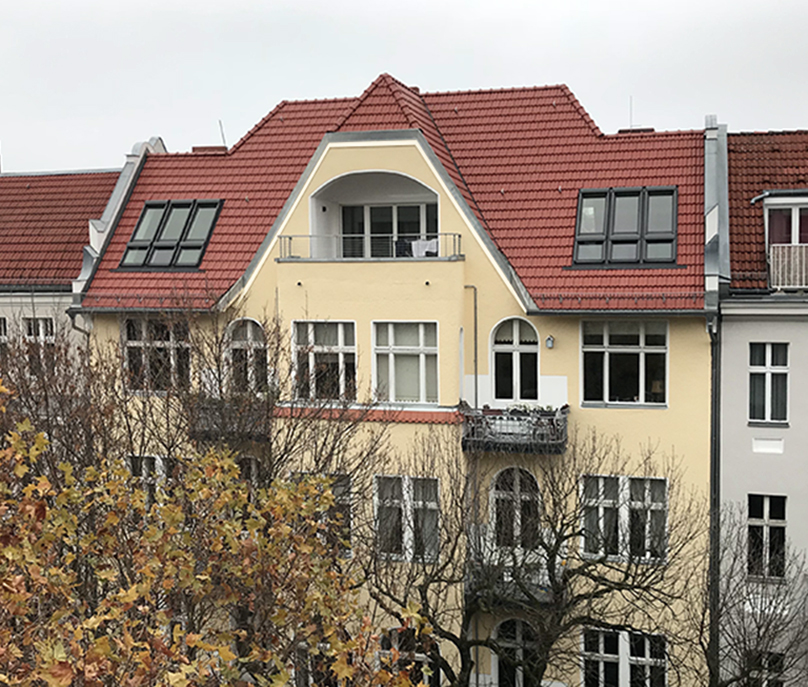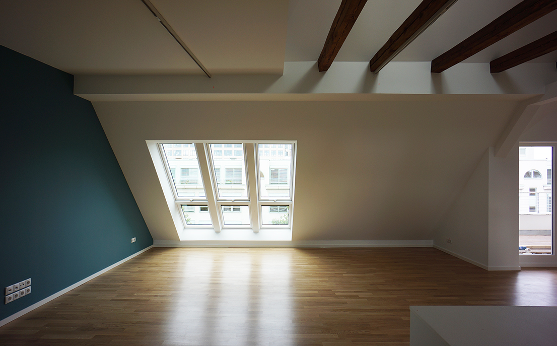 Der vorhandene Dachraum dieses typischen, gründerzeitlichen Berliner Hauses wurde zu einer großzügigen Wohnung ausgebaut. Dabei wurde der vorhandene Dachstuhl weitestgehend erhalten. Nur das Treppenhaus des Vorderhauses musste ins Dachgeschoss verlängert werden.