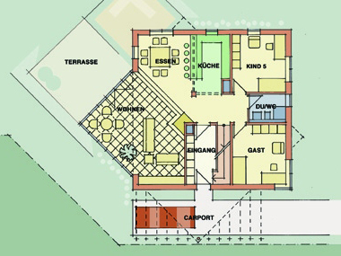 Dieses Haus für eine Großfamilie mit fünf Kindern stellte eine besondere entwurfliche Herausforderung dar. Der offene Grundriss ist geprägt von großzügigen Spielbereichen und Verbindungen zwischen den Räumen. Im Dachgeschoss befinden sich die Privaträume der Eltern. Der diagonale Grundstückszuschnitt wurde im Wintergarten und den dreieckigen Erkern aufgenommen.