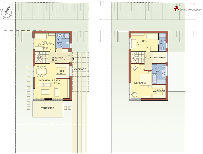 Die seitliche Erschließung des schmalen, langgestreckten Hauses optimiert den Grundriss und reduziert die Verkehrsflächen innerhalb des Hauses. Trotz der geringen Fläche wurde dadurch sogar eine kleine, zweigeschossige Eingangsdiele ermöglicht. Auch das Kellergeschoss enthält durch eine Abgrabung gut belichtete Nutzungsräume.