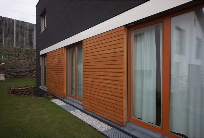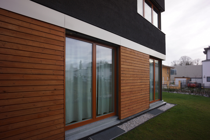Die Lage direkt neben einer Bahntrasse machte besonders aufwendige Schallentkopplungsmaßnahmen erforderlich. Die asymmetrische Orientierung des Hauses im Schatten einer Schallschutzwand gibt dem Haus ein eigenständiges Gesicht.