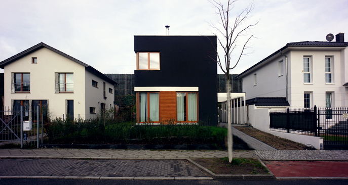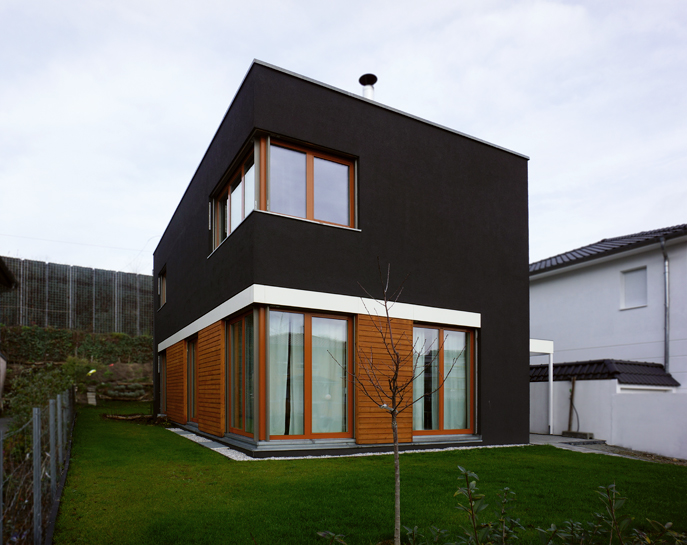 Auf einem sehr schmalen Grundstück wurde dieses besondere Einfamilienhaus realisiert, das intern nur "das kleine Schwarze" genannt wird. Nach verschiedenen Farbstudien entschieden sich die Bauherren für die prägnanteste Lösung.