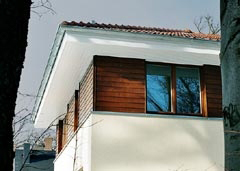 Das kompakte, zweigeschossige Wohnhaus für eine Familie wird durch eine zweite, separate Wohneinheit im Erdgeschoss ergänzt. Deren Dach wird als großzügige Dachterrasse genutzt. Die äußere Holzschalung im Obergeschoss gibt dem Haus einen wohnlichen Charakter, der im Inneren seine Entsprechung in Holzdielenböden und sichtbaren Dachsparren findet.