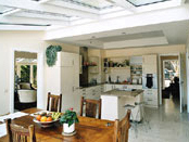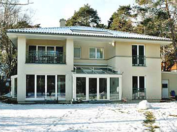Ein elegantes, zweigeschossiges Wohnhaus ist hier in Kleinmachnow entstanden. Die strenge Symmetrie der Straßenfassade wird gartenseitig asymmetrisch aufgelockert. Charakteristisch sind die große Wohnküche im Wintergarten und die Loggia im Obergeschoss.