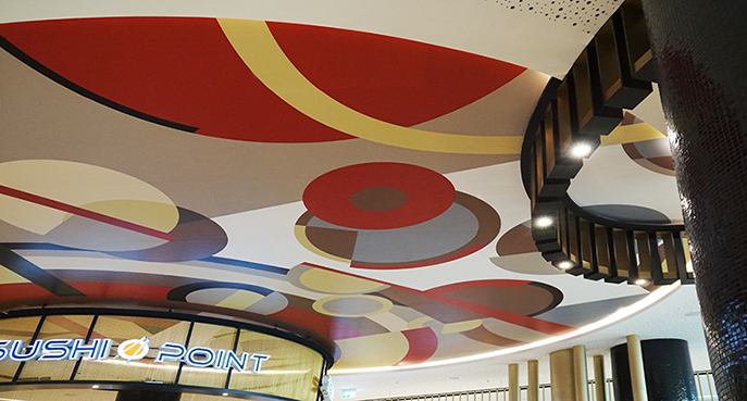 Der große, zentrale Sitzbereich dient allen Shops gemeinsam. Er wurde um rund 400 qm vergrößert. Die sanitären Anlagen wurden ebenfalls erweitert und neu gestaltet. Das Gestaltungskonzept der Innenarchitekten von Sonae Sierra aus Portugal, das schon dem gesamten Center zugrunde liegt, wurde hier neu interpretiert und weiterentwickelt. Aufwendige Fußboden- und Deckengestaltungen, den Raum gliedernde Paneele und Einrichtungen wurden als Sonderanfertigungen hergestellt.