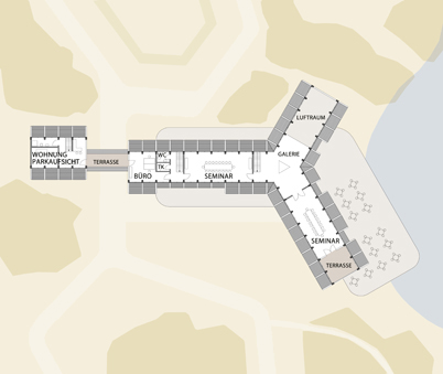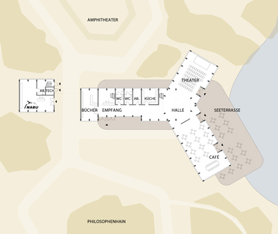 Alle zentralen Funktionen werden im Cafégebäude konzentriert, das dadurch zum Haupthaus auf der Halbinsel wird: Café, Theater, Rezeption, Seminarräume, Buchladen, Verwaltung, Hausmeisterwohnung.
