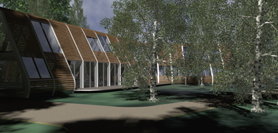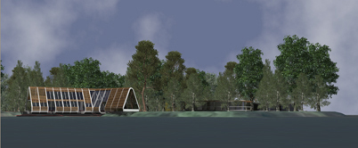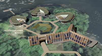 Um eine Zersiedelung der Inselspitze zu vermeiden, wird darauf verzichtet, Einzelhäuser für die Ferienwohnungen anzubieten. Statt dessen werden drei kompakte, eingeschossige Gebäude konzipiert, die jeweils 6-8 Apartments aufnehmen. Die V-Form ermöglicht es, dass alle Apartments über Seeblick verfügen, ohne sich gegenseitig die Sicht zu nehmen. Die Gebäude schweben leicht über der Landschaft, so dass das modellierte Gelände sie umfließen kann.