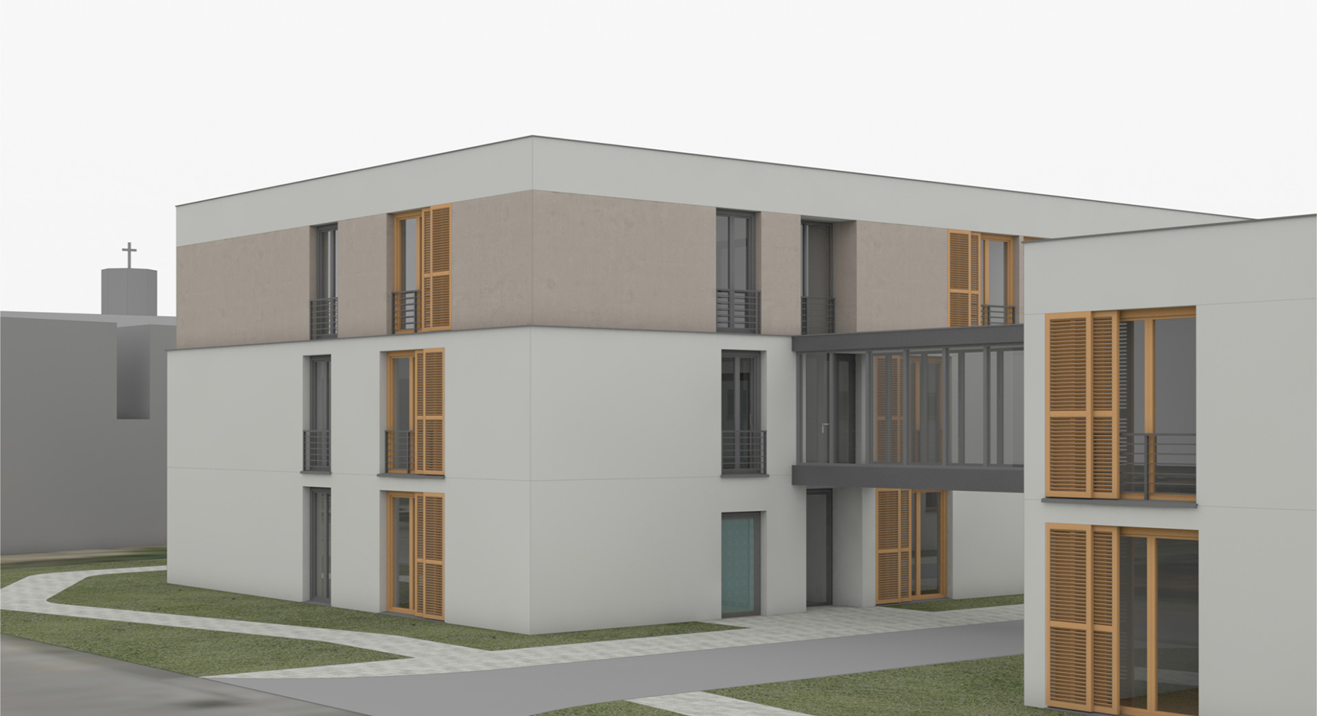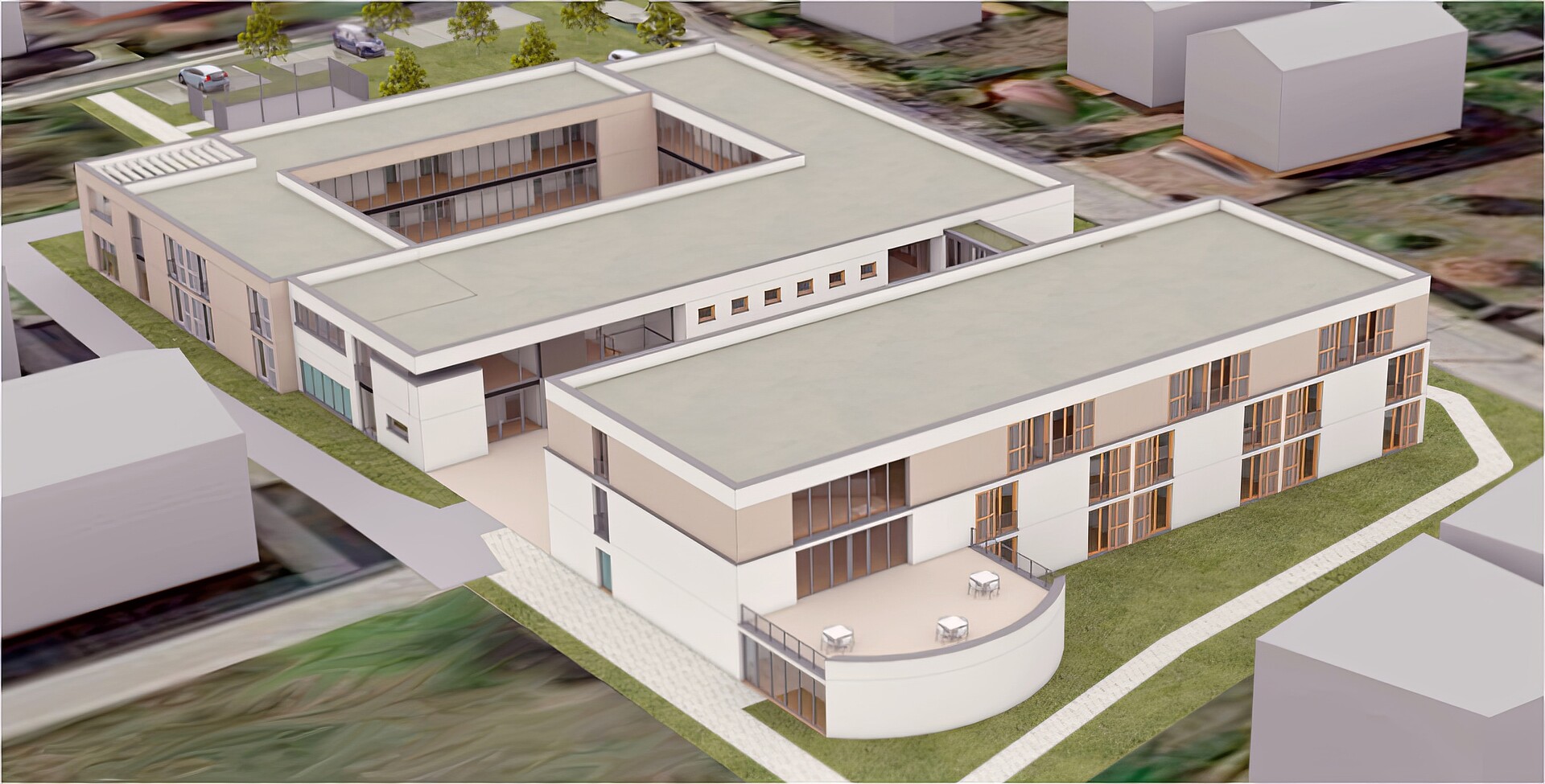Die Gestaltung des Ergänzungsbaus soll die klare, moderne Architektur des Bestandsgebäudes aufnehmen, so dass ein harmonisches Gesamtensemble entsteht. Das zweite Obergeschoss wird dabei farblich abgesetzt, um optisch eine Dachzone auszubilden.