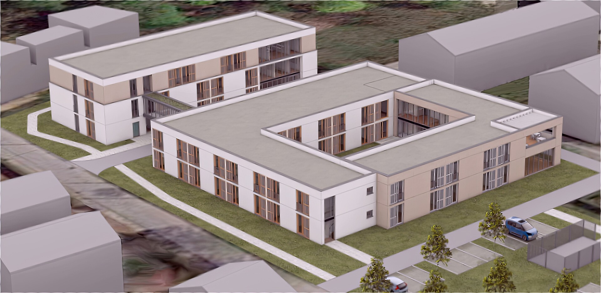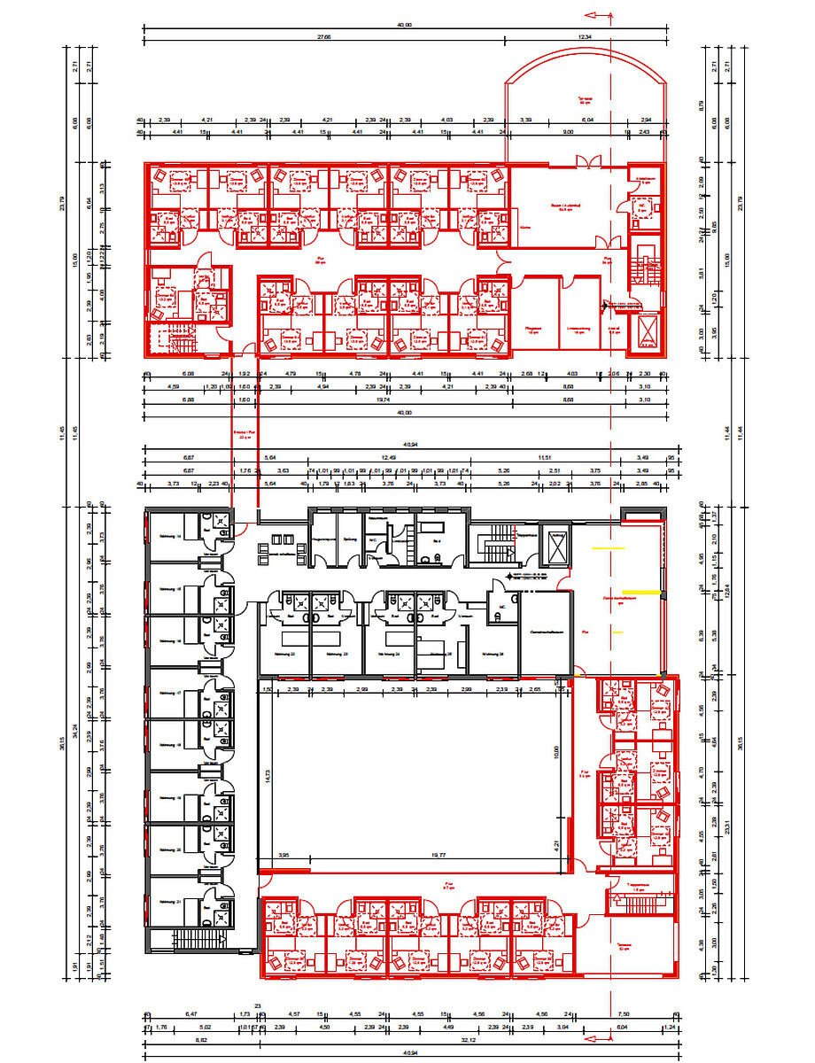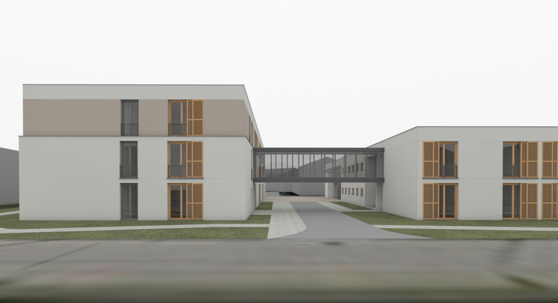 Vorgeschlagen wird die Ergänzung des L-förmigen Baukörpers zu einem O. Dafür wird auf der Süd- und Ostseite ein einhüftiger, zweigeschossiger Ringschluss hergestellt. Der Flur wird an den einseitig offenen Flur des westlichen Flügels und an den vorhandenen Gemeinschaftsraum auf der Ostseite angeschlossen.