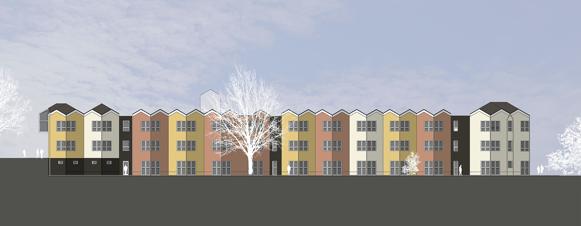 Das Farbkonzept geht auf die ursprüngliche, architektonische Gestaltungsabsicht ein. Die einzelnen Vor- und Rücksprünge werden jeweils wie ein eigenständiges Haus betrachtet und mit einer eigenen Farbe versehen. Hierfür wird ein Dreiklang aus einem gelblichen, einem rötlichen und einem hellen Farbton verwendet. Technische Sonderbauteile werden in dunkelgrau behandelt. Dadurch entsteht eine starke Kleinteiligkeit und Rhythmisierung der Fassade, die das Gebäude nunmehr tatsächlich in die dörfliche Struktur der Umgebung einpasst. Insbesondere die langen Seitenfassaden wirken jetzt wie eine Reihung einzelner Häuser.