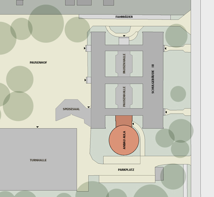 - Neubau einer Aula mit Fachräumen für Kunst und Musik als Anbau an das bestehende Schulgebäude