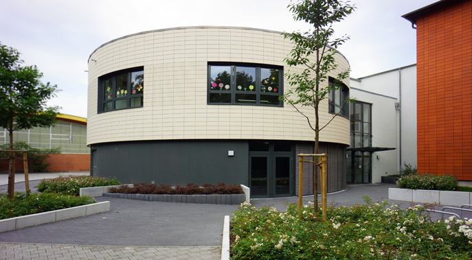Ein runder Baukörper wurde mittig zwischen den beiden dreigeschossigen Gebäudeflügeln angeordnet. Die Kreisform symbolisiert dabei die Nutzung als Versammlungsraum. Gleichzeitig dient sie der optimalen Wegeführung zwischen dem Bestand und dem neuen Bauteil.