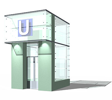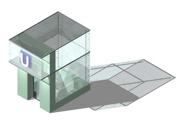 Die Form des Aufzugs spielt auf die von Grenander für die Bahnhöfe der Linie U8 vorgesehenen Treppenportale an. Das Band aus Umwehrung und Treppenportal wird in abstrahierter Form wiederholt.