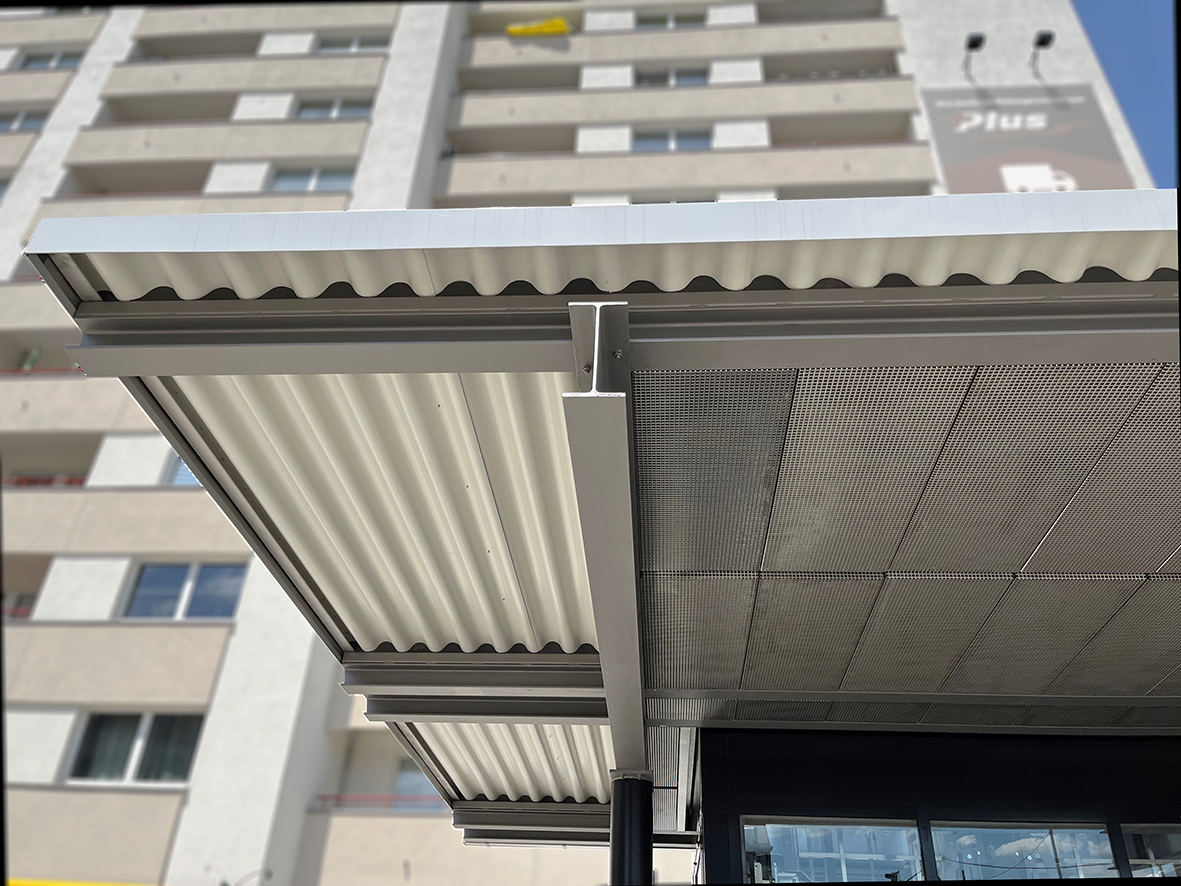 Die Gestaltung des neuen Eingangsgebäudes nimmt Bezug auf die Historie des Flughafens. Die Materialien Stahl und Wellblech und die Farbigkeit in Silber und Schwarz erinnern an die JU52, die von hier im Linienverkehr flog.