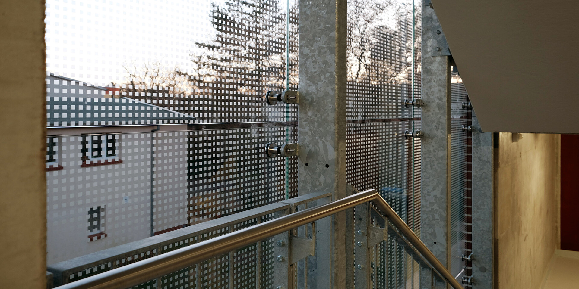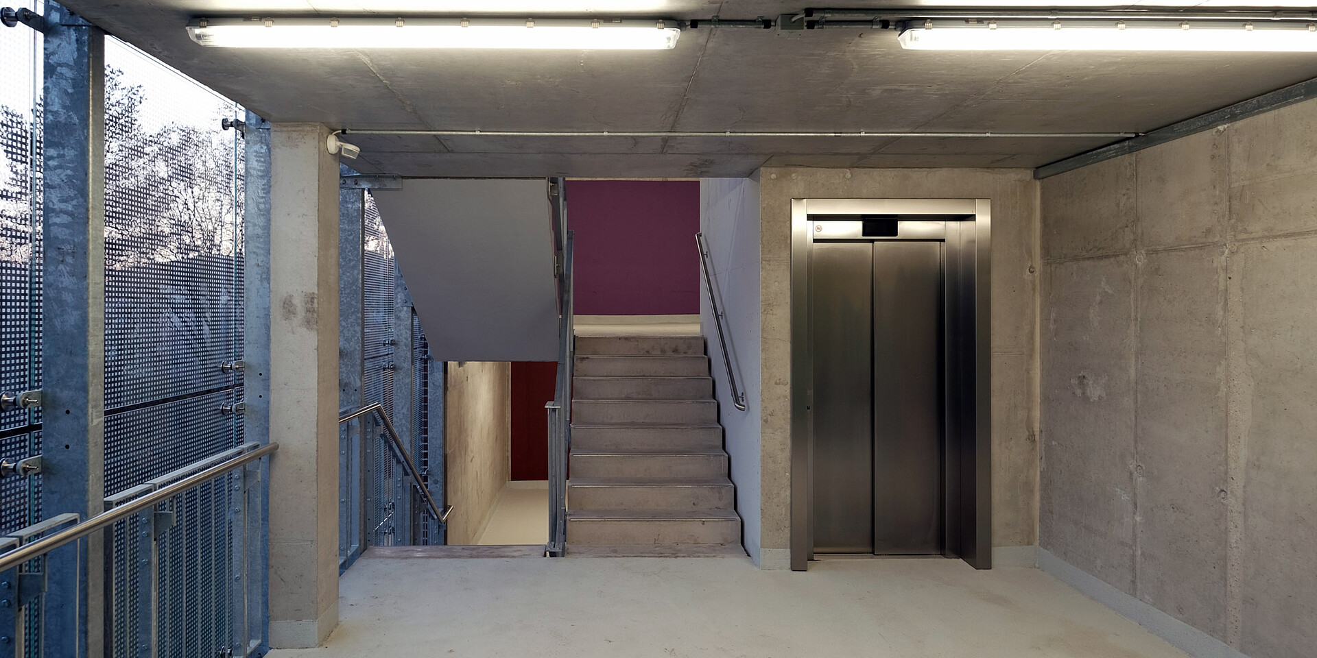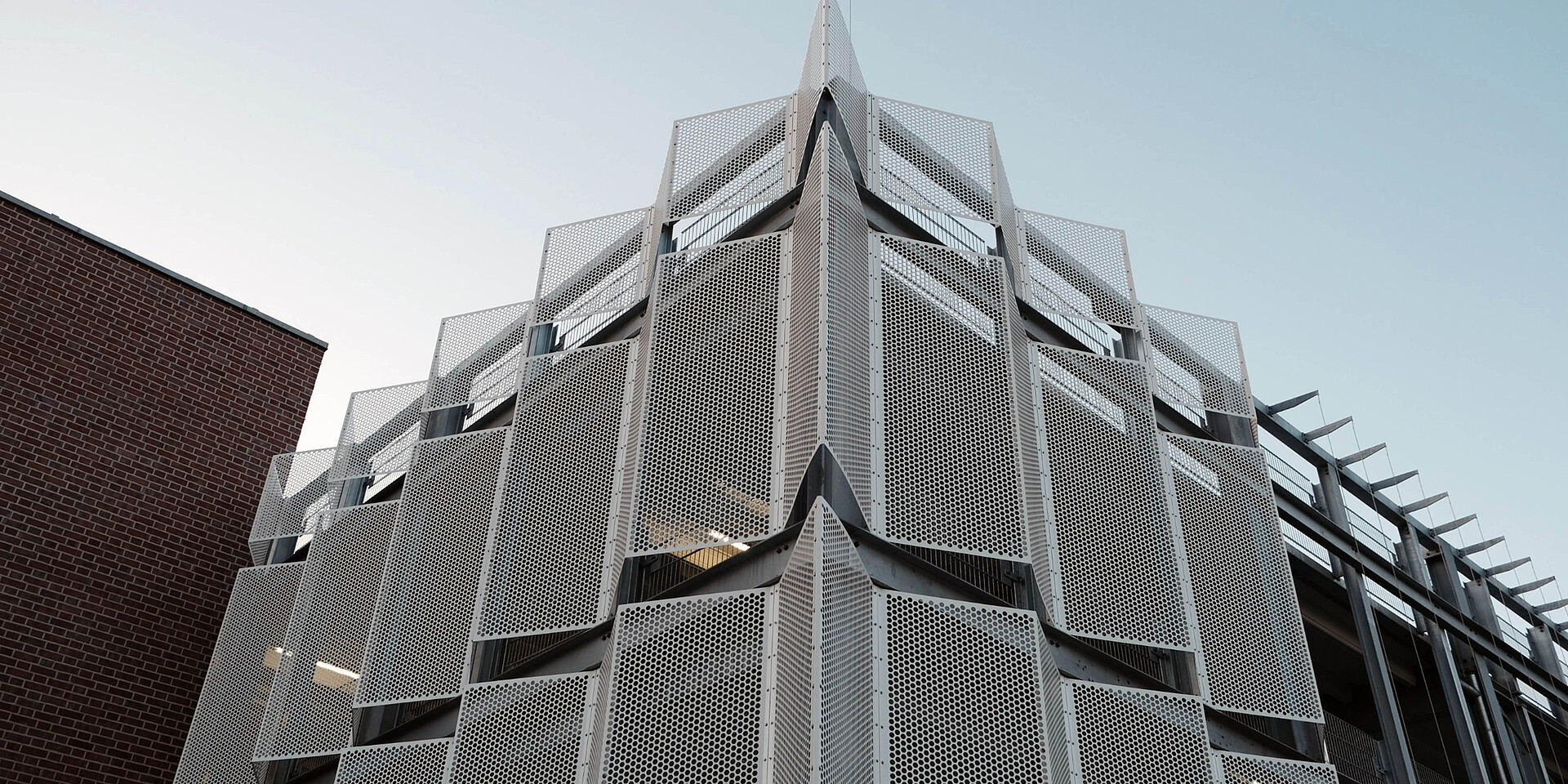 Die Parkebenen wurden mit einer Vorhangfassade aus gefalteten Lochblechen umkleidet. Dadurch erhält der vergleichsweise große Baukörper eine leichte, teiltransparente Hülle. Gleichzeitig werden die erforderlichen Lüftungsquerschnitte für das Parkhaus über die Lochbleche bereitgestellt. Die Elemente sind geschossweise durch horizontale Querträger gegliedert.