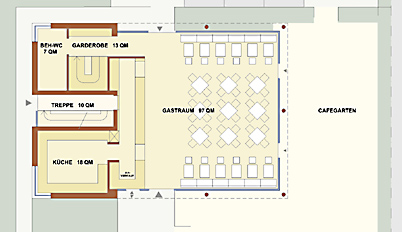 Das attraktive Waldgrundstück liegt direkt am Teltowkanal, an der Schleusenbrücke nach Kleinmachnow. Im Erdgeschoss befindet sich ein Restaurant mit Biergarten, im Obergeschoss zwei Wohnungen. Der Farbton der Fassade nimmt Bezug auf den alten Kiefern-Baumbestand.